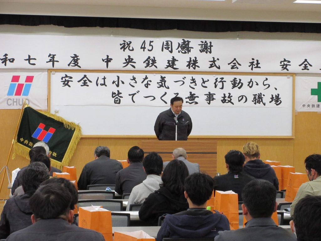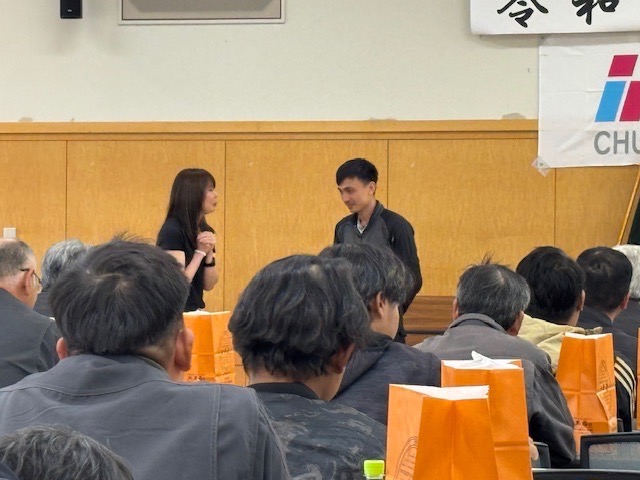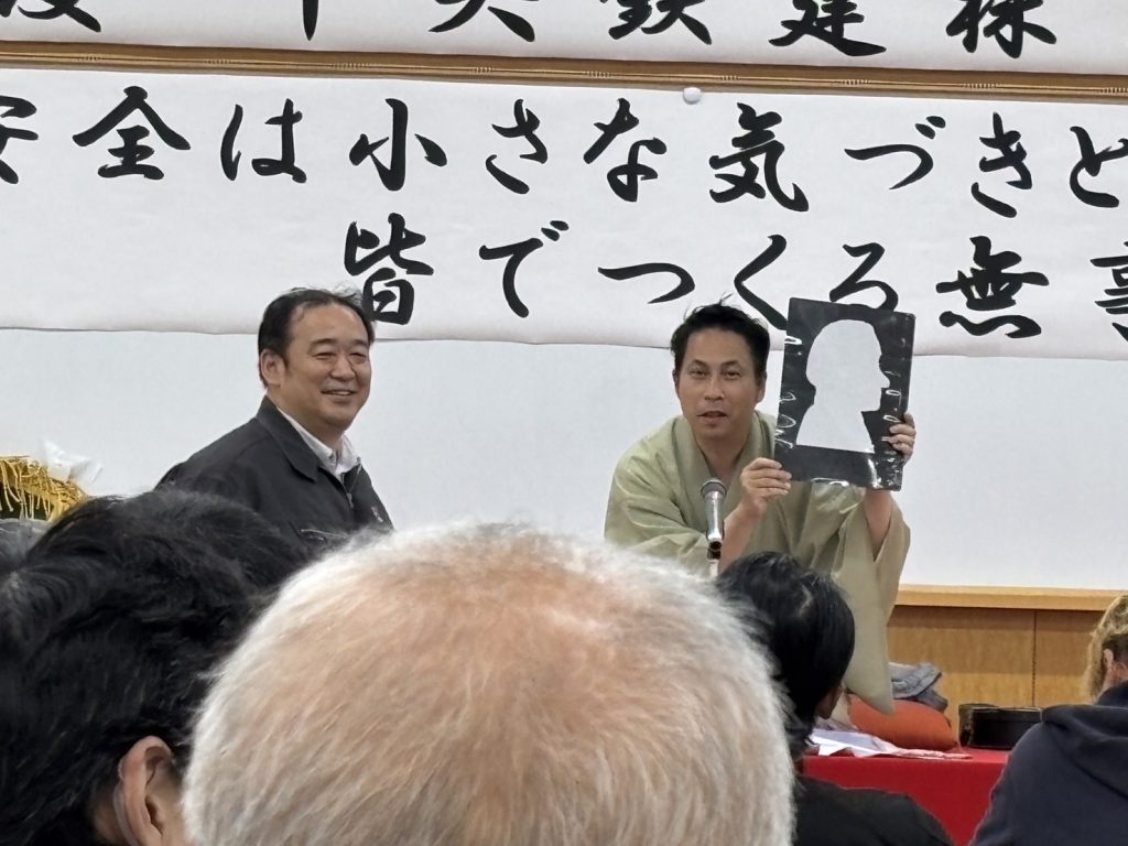 100名ほどの社員、協力会社の方々が集まり、安全意識を高めました。また、講師には落語家№1決定戦初代チャンピオンの林家笑丸さんに講演を頂き、紙を見ず後ろ手で切り絵を作ってもらったり、即興で中央鉄建の歌を作って頂いたりと、大いに場を和ませて頂いた他、外国人技能実習生との接し方について監理団体・オアシス協同組合の上尾所長に実演を織り交ぜて行なって頂き、改めてチームワークを強化する事ができました!